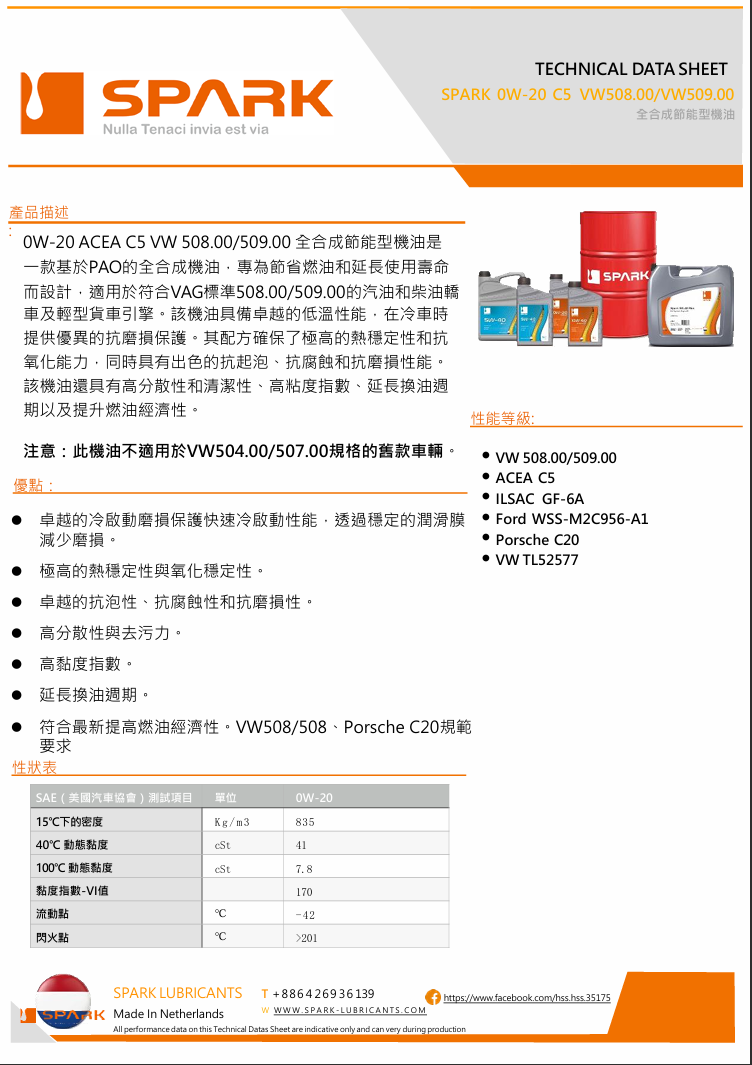 0W-20 ACEA C5 VW 508.00/509.00 全合成節能型機油是一款基於PAO的全合成機油。專為節省燃油和延長使用壽命而設計,適用於符合最近豪華車種VAG標準508.00/509.00的汽油和柴油轎車及輕型貨車引擎。SPARK 0W20 C5 Premium LL機油具備卓越的低溫性能,在冷啟動時提供優異的磨損保護。其配方確保了極高的熱穩定性和抗氧化能力,同時具有出色的抗起泡、抗腐蝕和抗磨損性能。該機油還具有高分散性和清潔性、高粘度指數、延長換油週期以及提升燃油經濟性。