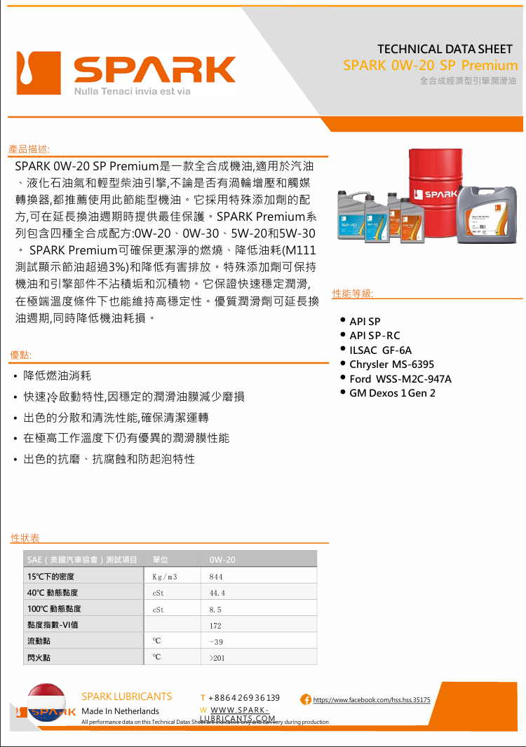 SPARK 0W-20 SP Premium ECO是一款全合成機油,適用於汽油、 液化石油氣和輕型柴油引擎,不論是否有渦輪增壓和觸媒轉 換器,都推薦使用此節能型機油。它採用特殊添加劑的配方, 可在換油週期間提供突出的保護。SPARK Premium系列包 含四種全合成配方:0W-20、0W-30、5W-20和5W-30。 SPARK Premium可確保更潔淨的燃燒、降低油耗(M111測試 顯示節油超過3%)和降低有害排放。特殊添加劑可保持機油 和引擎部件不沾積垢和沉積物。它保證快速穩定潤滑,在極 端溫度條件下也能維持高穩定性。優質潤滑劑可延長換油 週期,同時降低機油耗損。