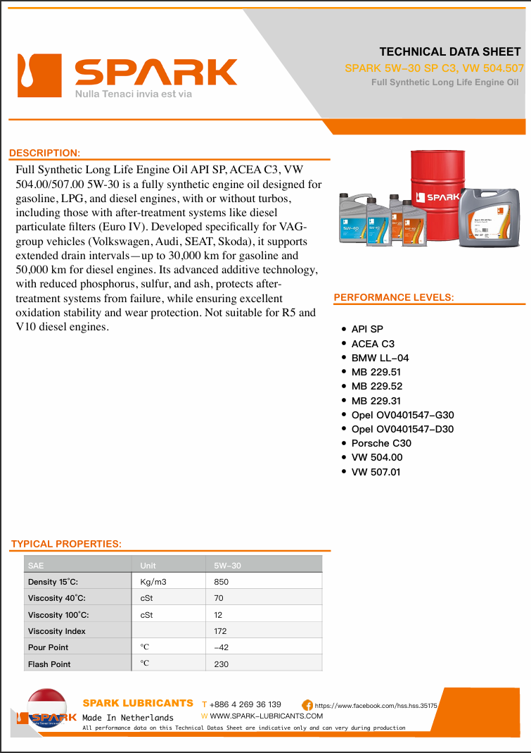 Full Synthetic Long Life Engine Oil API SP, ACEA C3, VW 504.00/507.00 5W-30 is a fully synthetic engine oil designed for gasoline, LPG, and diesel engines, with or without turbos, including those with after-treatment systems like diesel particulate filters (Euro IV). Developed specifically for VAGgroup vehicles (Volkswagen, Audi, SEAT, Skoda), it supports extended drain intervals—up to 30,000 km for gasoline and 50,000 km for diesel engines. Its advanced additive technology, with reduced phosphorus, sulfur, and ash, protects aftertreatment systems from failure, while ensuring excellent oxidation stability and wear protection. Not suitable for R5 and V10 diesel engines.